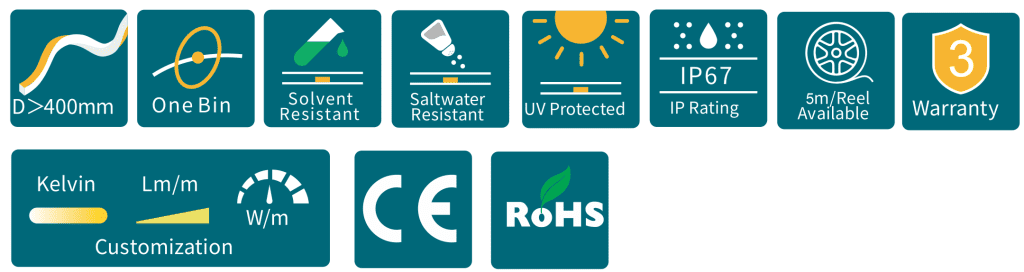 .These UV, flame, solvent, and saltwater resistant LEDs are available in various dimensions, bending options, and colour options including Single Color, Dynamic White, RGB,configurations.