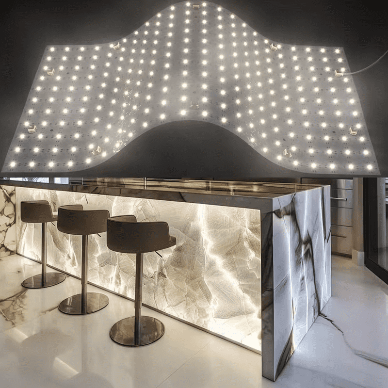 The Flexi Panel range consists of ultra-thin, flexible LED light sheets designed for direct adhesion to flat or curved surfaces. These panels offer a variety of lighting options including Single Color, Dynamic White, RGB/W, and Pixel control, enabling customisable illumination, and can be cut to desired shapes, maximising design and application versatility.